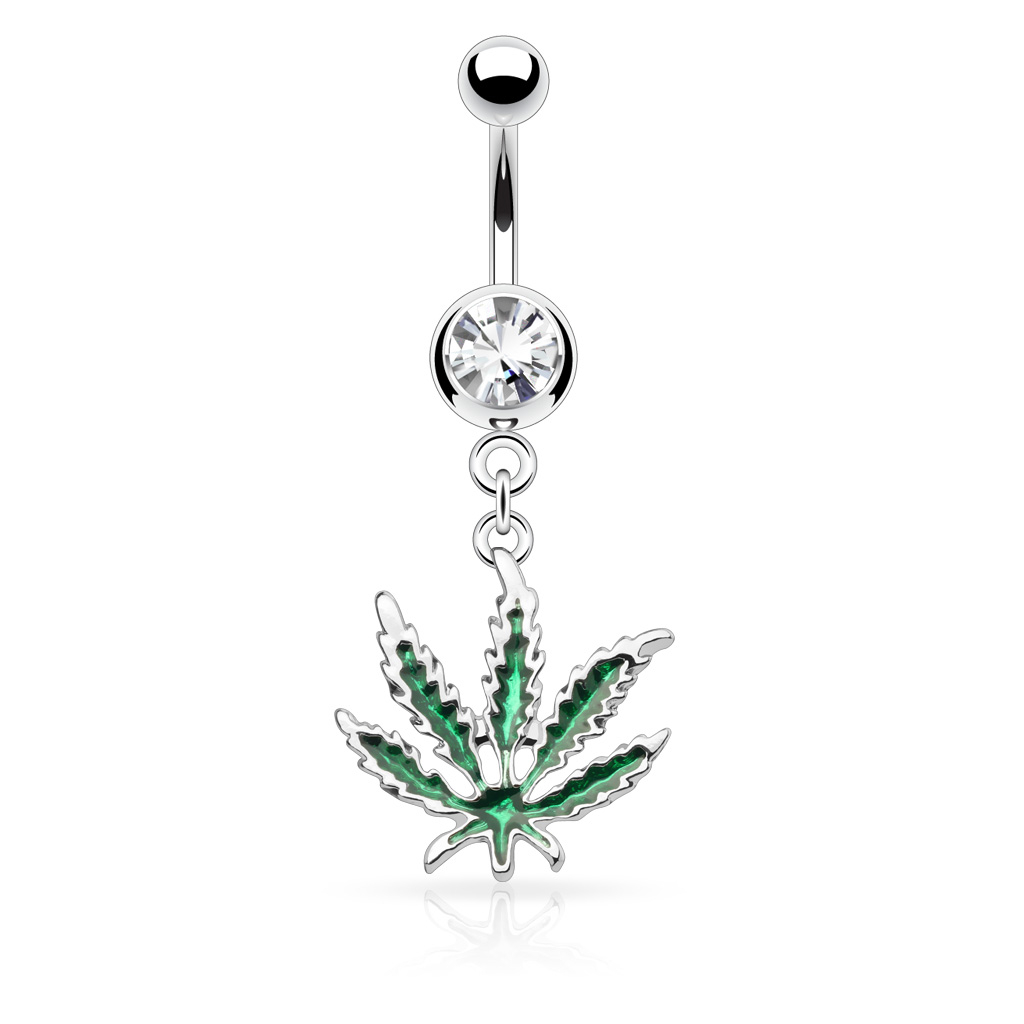 Ez a gyönyörű, marihuána levelet mintázó köldökékszer orvosi acélból készült, ami az egyik legkiválóbb piercing alapanyag.