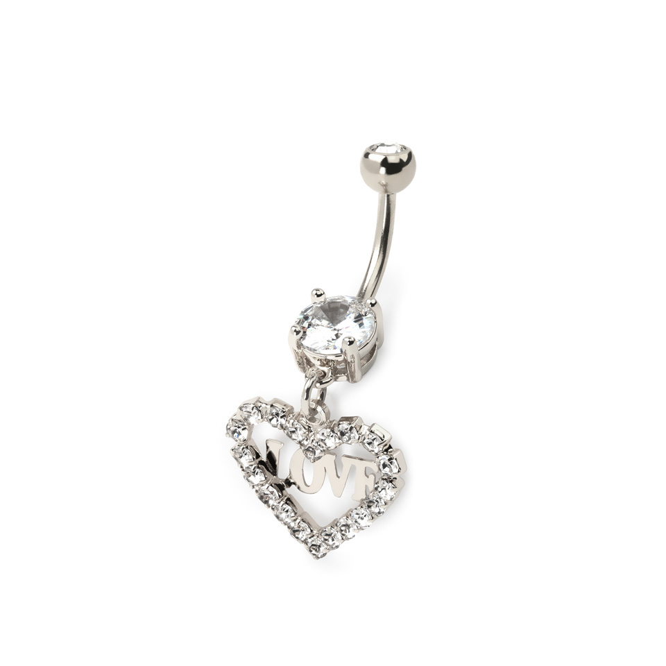 Köldök piercing, csillogó kövekből kirakott szív medállal és love felirattal