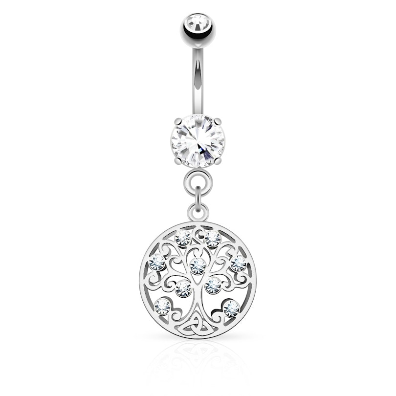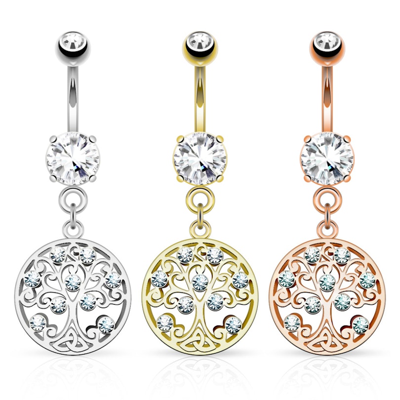 Köldök piercing, csillogó kövekkel és életfa medállal