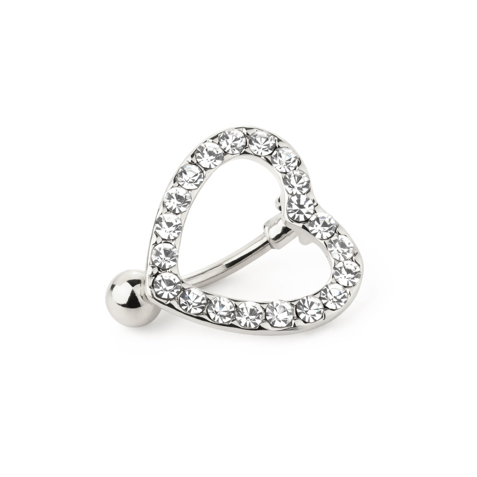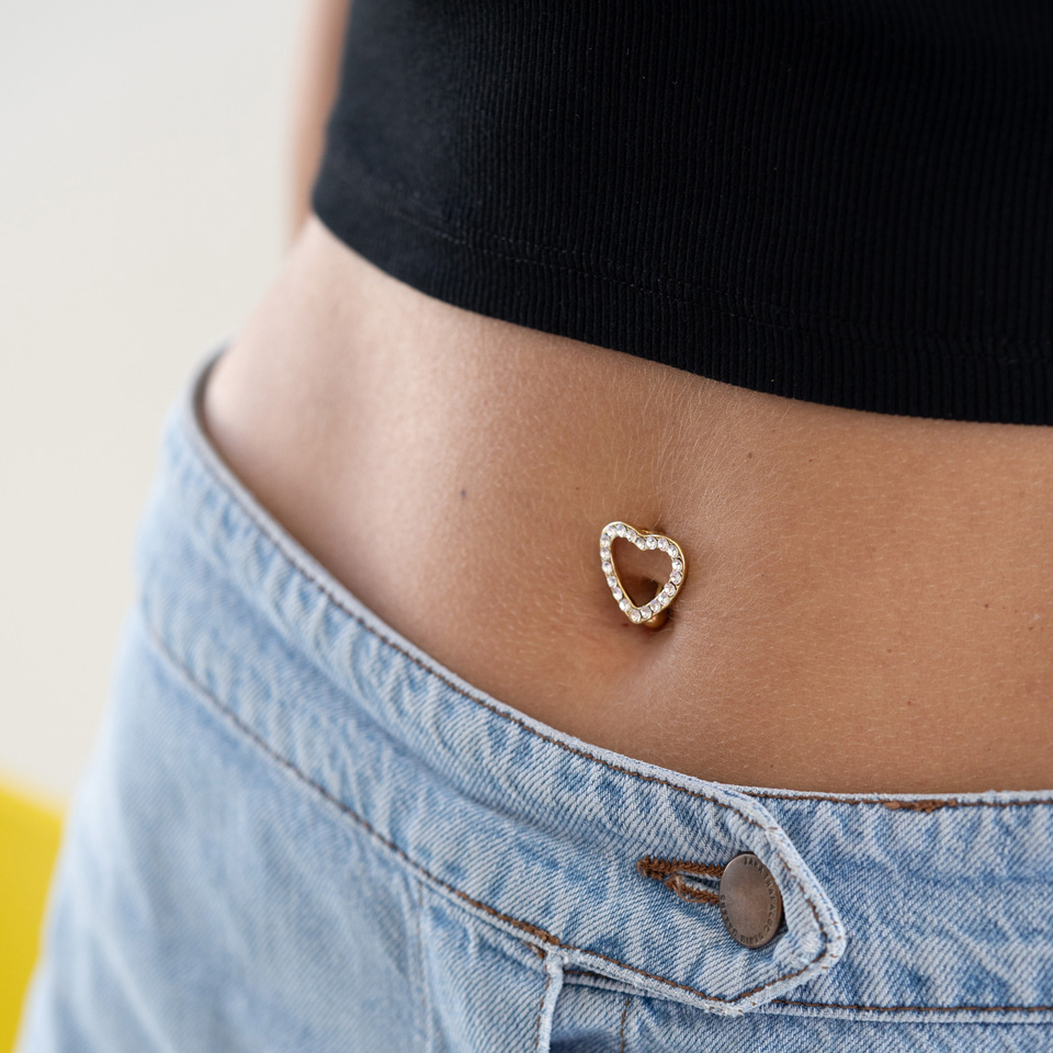Köldök piercing, csillogó kövekkel kirakott szív dísszel