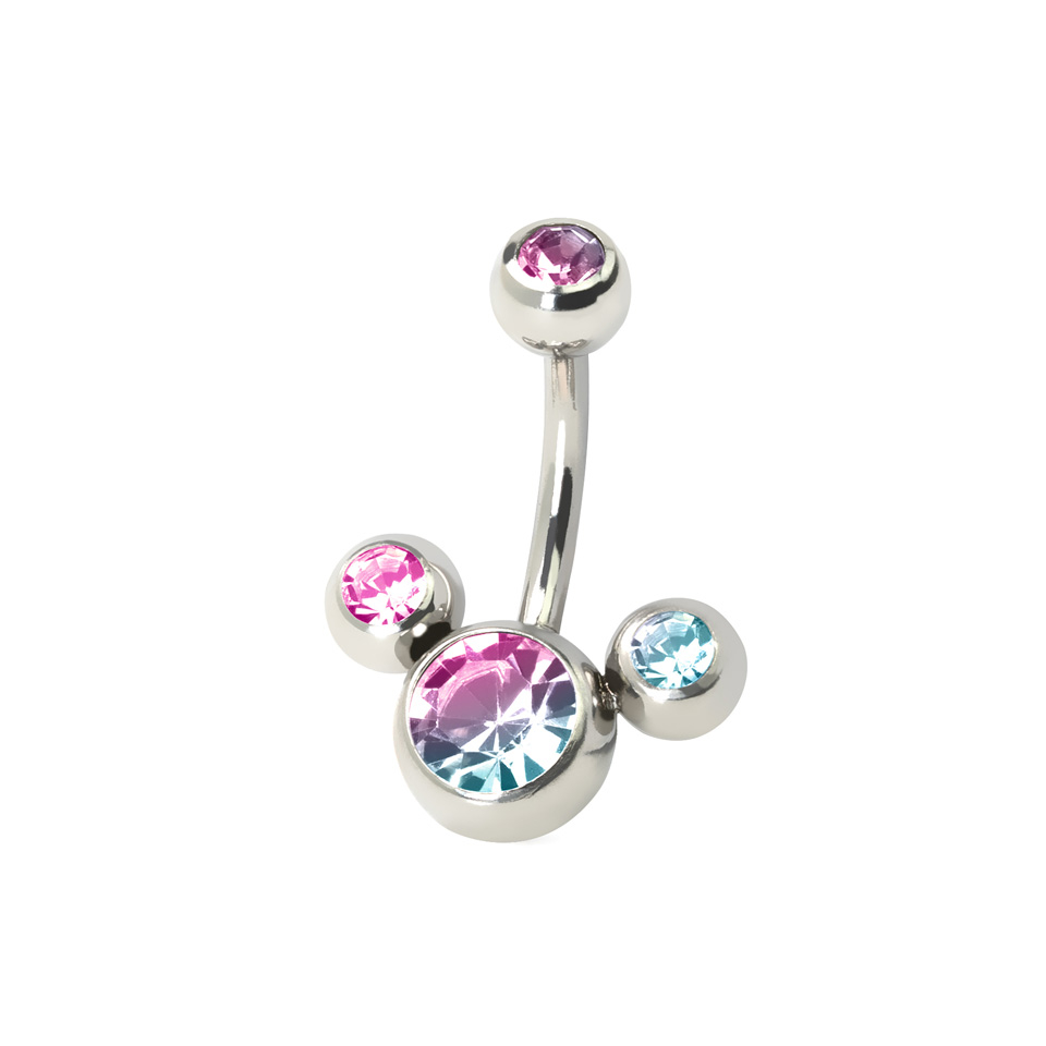 A köldök piercingek rengeteg színben és formában elérhetőek, a fenti képen ismét egy nem mindennapi darabot mutatunk be. A klasszikus 10mm-es hajlított barbell szár tetejét és alját is egy csodálatosan csillogó kő díszíti tokos foglalatban.