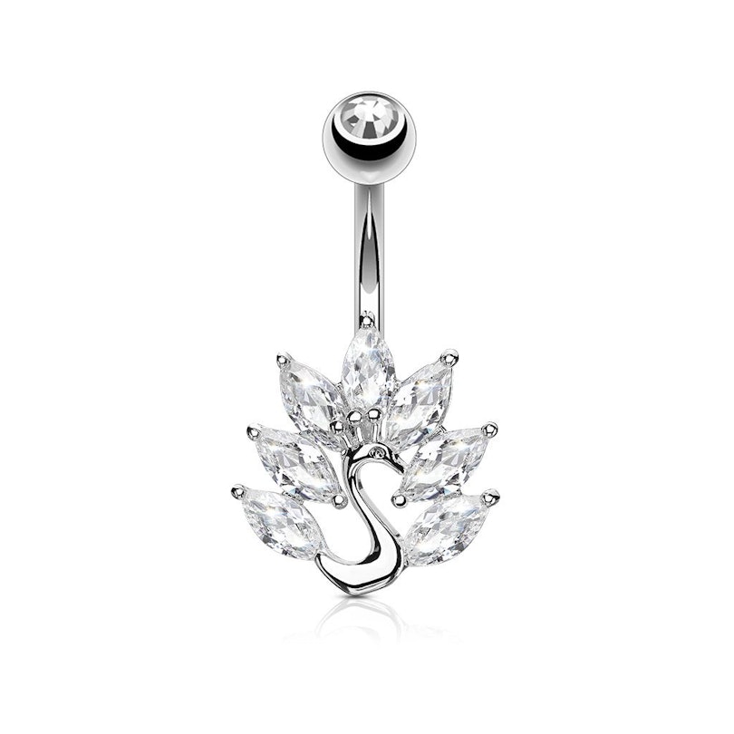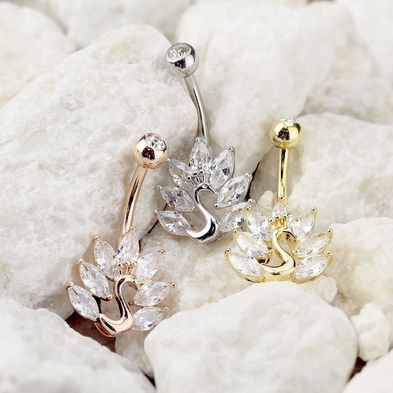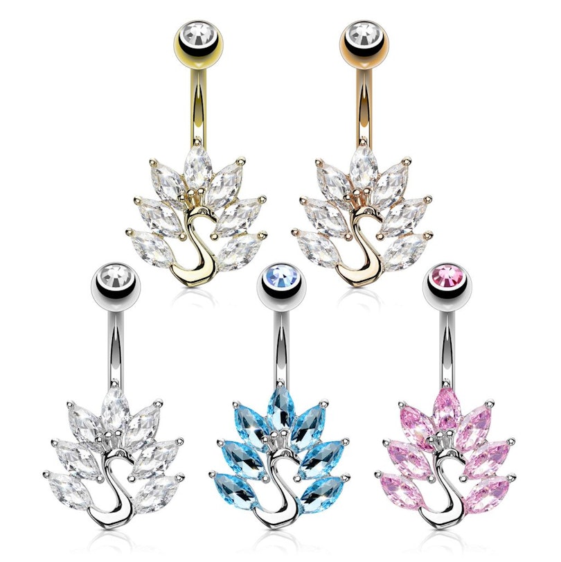 Egy nem mindennapi köldök piercingre találtál, amit egy csodálatos páva díszít. A páva teste és gyönyörű tollai hegyes-ovális (Marquise) csiszolt kövekből épülnek fel. Tudtad, hogy egy hím pávának kb. 100-150 faroktolla is lehet?
