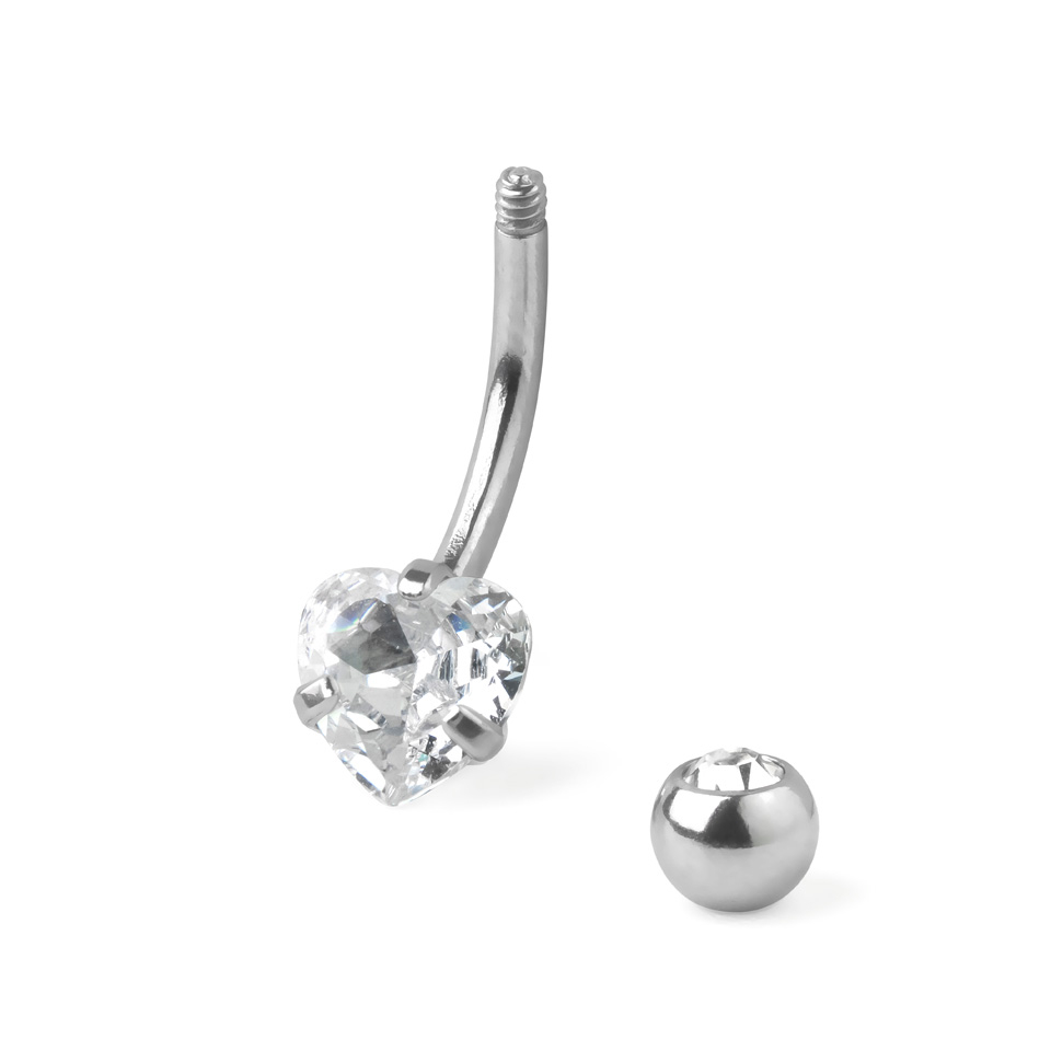 A klasszikus orvosi fémből készült hajlított barbell szár tetején egy kis kő található, tokos foglalatban, a szár alját pedig egy nagyobb méretű szív formájú kő díszíti.