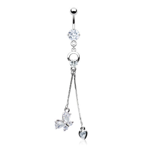 Ezt a pompás köldök piercinget hosszú láncok, és ragyogó fehér kövek diszitik. A fantasztikusan kidolgozott medál rész egy karikával kezdődik, aminek az alsó részén egy sziv alakú kő ül. A szivhez csatlakozik még egy karika, ami a két láncot tartja. A láncok nincsenek rögzitve, igy szabadon tudnak mozogni, követve a tested ringatását.