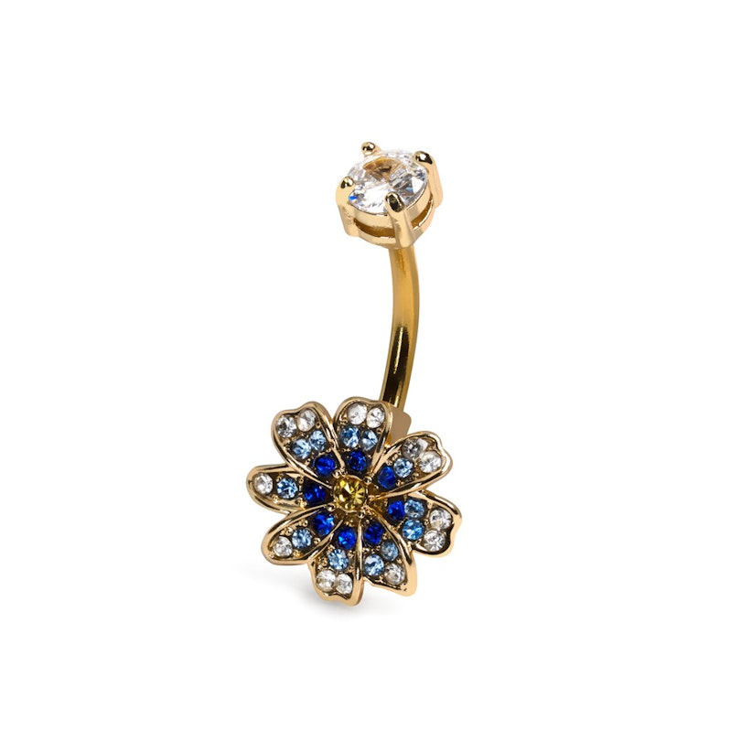 Ez az aranyos köldökpiercing a haspólós szezonra készült. Egy apró, különböző kék árnyalatú kövekből kirakott virágot ábrázol, melynek közepén egy sárga kő ragyog. A felső golyóban átlátszó kő található.