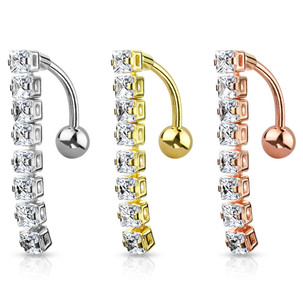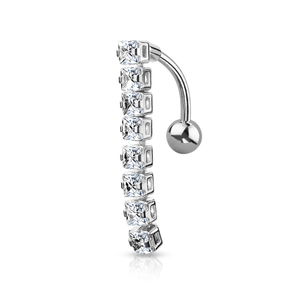 Az itt látható ékszer szára orvosi acélból készült. A tetején nem egy golyó van, mint ahogy az a hagyományos köldökpiercingeken megszokott. Mivel az ékszer fordított, a golyó az alján helyezkedik el. A függő, amely általában alul kap helyet, ebben az esetben a piercing tetejét díszíti. Ha a köldököd alsó része van átszúrva, ez az ékszer ideális számodra. De hagyományos köldökpiercingként is használhatod: ebben az esetben a kövek felülre kerülnek, és eltakarják a szárat, a golyót és a köldöködet.