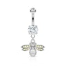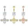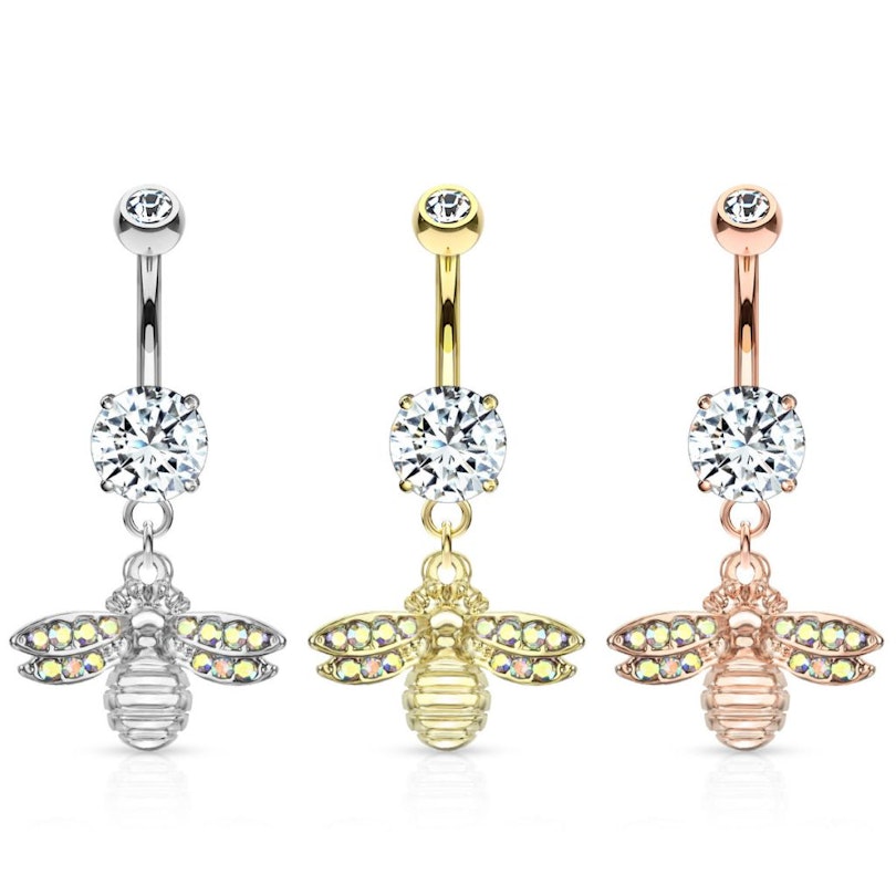 Az itt látható köldökpiercinget egy aranyos méhecske medál díszíti. A méhecske sárgarézből készült, a szárnyain lévő apró kövek a szivárvány több színében pompáznak. Ezt aurora borealisnak is nevezik, mivel a kő a sarki fényre emlékeztet. Az ívelt szár 10 mm hosszú, a vastagsága 1.6 mm. A legtöbb köldökpiercingünk szárához hasonlóan ez is orvosi acélból készült.