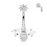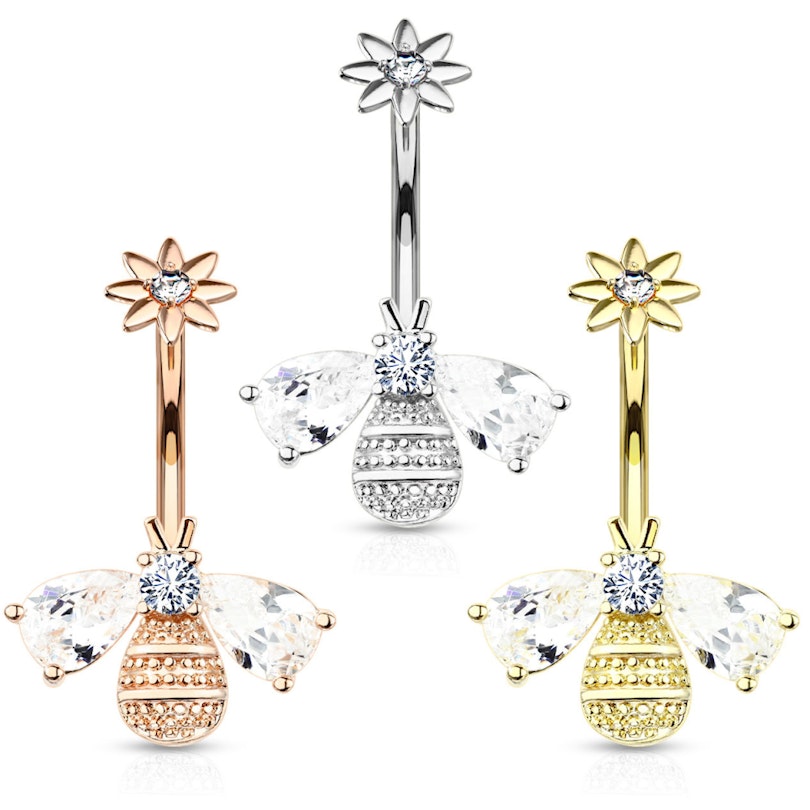 Egy köldökpiercingnek nem feltétlenül csak egy felső, és egy kicsit nagyobb alsó golyóból kell állnia. A kialakítása ennél sokkal kreatívabb is lehet, ahogy ez ennél a modellnél is látható. A belső menetes, lecsavarható felső golyónak virág alakja van, a közepén egy kis kő helyezkedik el. A virág alatti ívelt szár 10 mm hosszú. A szár alsó részét egy apró méhecske díszíti, amelynek a szárnya kövekből van kirakva. A méhecske feje szintén kövekből áll. Mivel a tervező ügyelt a részletekre, a test meglehetősen élethűnek tűnik.