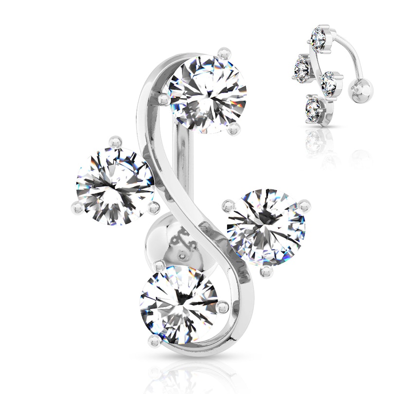 Ez egy nagyon egyedi és aranyos köldökpiercing, négy ragyogó kővel, amiket egy S alak fog közre. Orvosi acélból készült, a legelterjedtebb piercing alapanyagból. 100%-ban nikkelmentes, időtálló anyag.