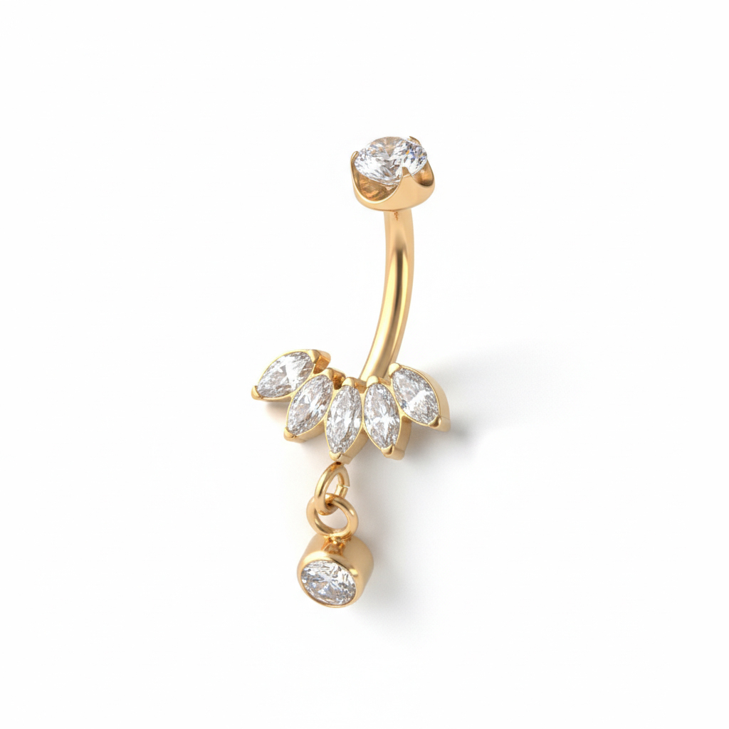 Bemutatjuk a hasad legújabb ékét, amely egyszerre kihívó, mégis elegáns. Ez a titán köldökpiercing, amelyet marquise kövek és egy medál díszít, hipoallergén és vízálló (bizony, se rozsda, se hirtelen jelentkező irritáció).
