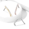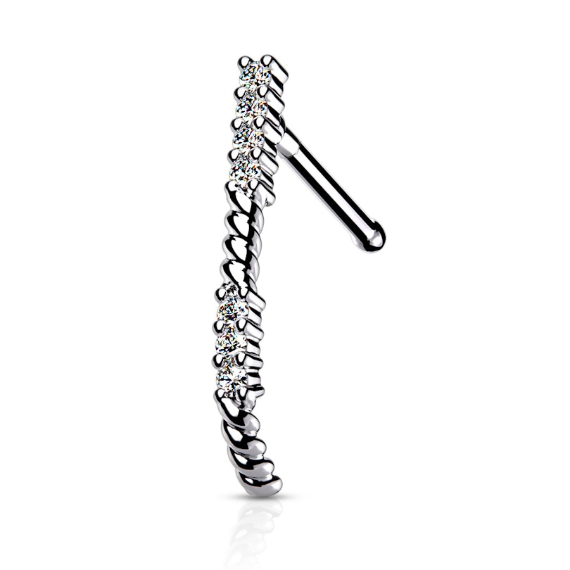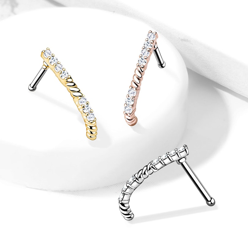 Ez a jellegzetes ékszer egyszerre egyedi és dögös, ahogy a ragyogó kövek felsorakoznak egészen az orrlyukig. Az egyedi crawler dizájn gerincének teljes hossza 13 mm. Ez az orrékszer 3 különböző színben kapható: arany, rose gold és ezüst. Az ékszerdarab a nostril piercing standard méretével rendelkezik: 0,8 mm-es szárvastagság és 6 mm-es hossz. Egy nagyon izgalmas darab, ami minden orrékszer-gyűjtemény elengedhetetlen tagja.