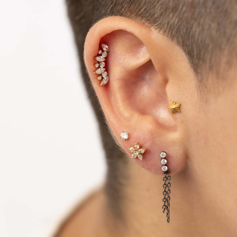Elhelyezkedés: Tragus, Spiderbite, Snakebite, Medusa, Madonna, Lower labret, Fülcimpa, Helix, Conch, Forward helix, Angelbite
