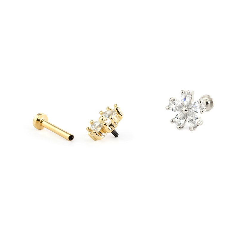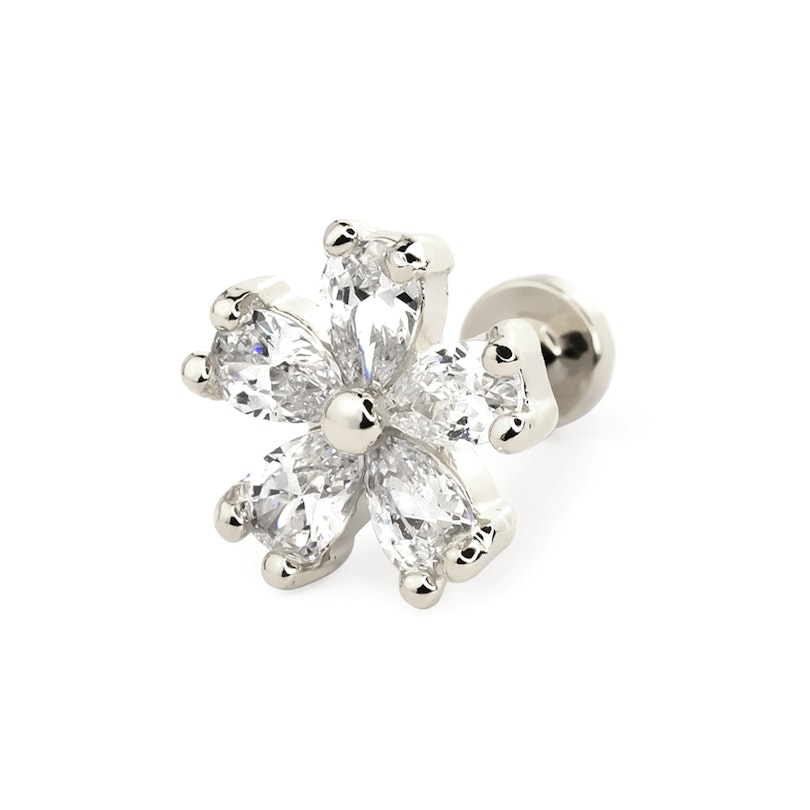 Ez az ékszer orvosi acélból készült és különböző bevonatokkal láttuk el, hogy több csodás szín közül is tudj választani. A labret fejét egy fantasztikus kis öt szirmú virág díszíti. A szirmokat egy-egy ragyogó kő szimbolizálja, amiket karmos foglalat tart fixen a helyén.