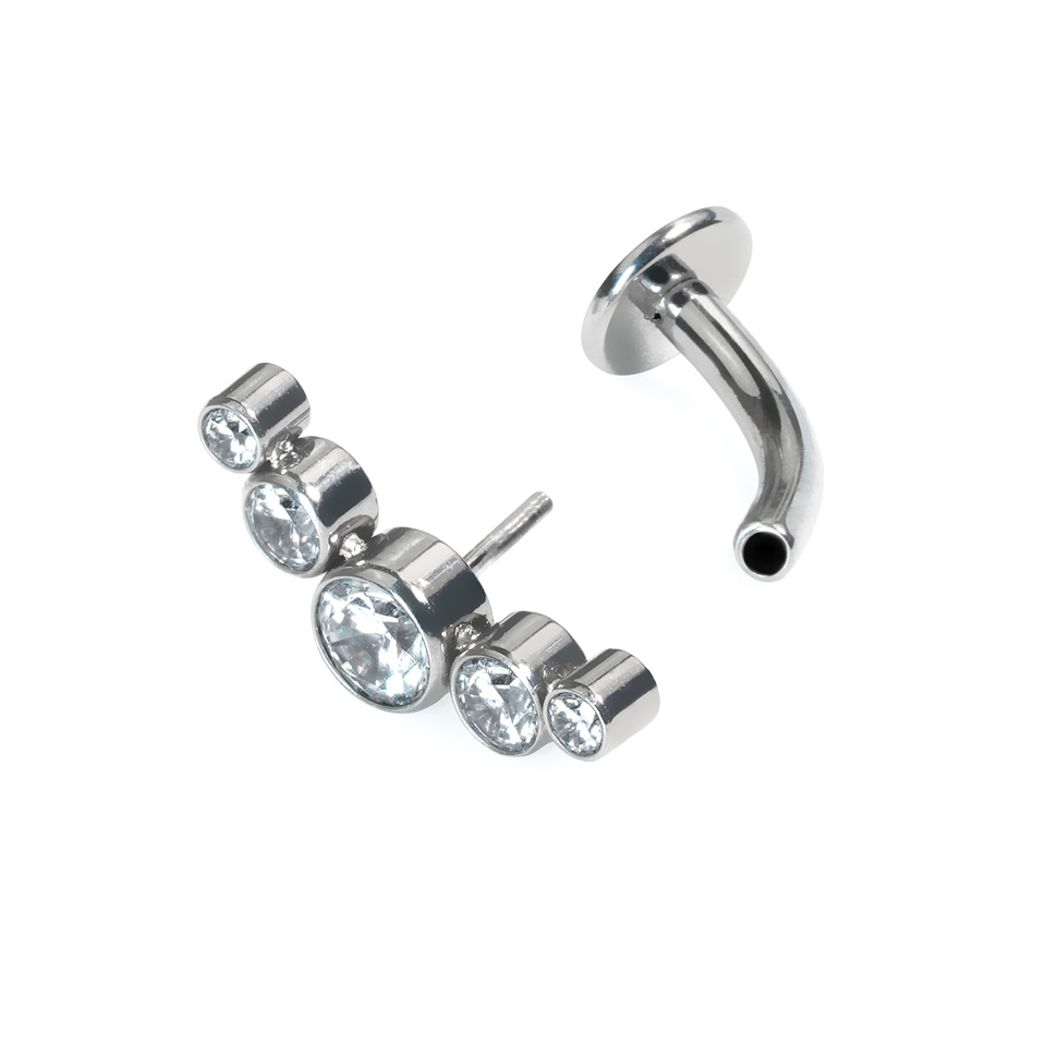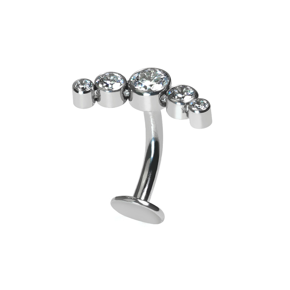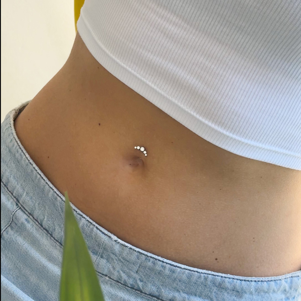 Ezt a lebegő, titán köldökpiercinget öt, tokos foglalatban elhelyezett kristály díszíti. Mivel titánból készült, hipoallergén és vízálló. Az ékszer push-in záras, vagyis ahhoz, hogy rögzítsd a piercingedben, csak egy kicsit meg kell hajlítanod a tűt, és bele kell illesztened a szárba.