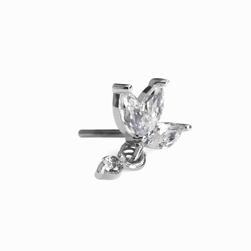 Ezt a káprázatos 14 karátos aranyból készült push-in fejet lótuszvirág alakban elhelyezett, karmos foglalatba ágyazott marquise cirkónia kövek hármasa díszíti. A virág közepéből emellett egy dísz is lóg, amelyben kerek, karmos foglalatba ágyazott kő található.