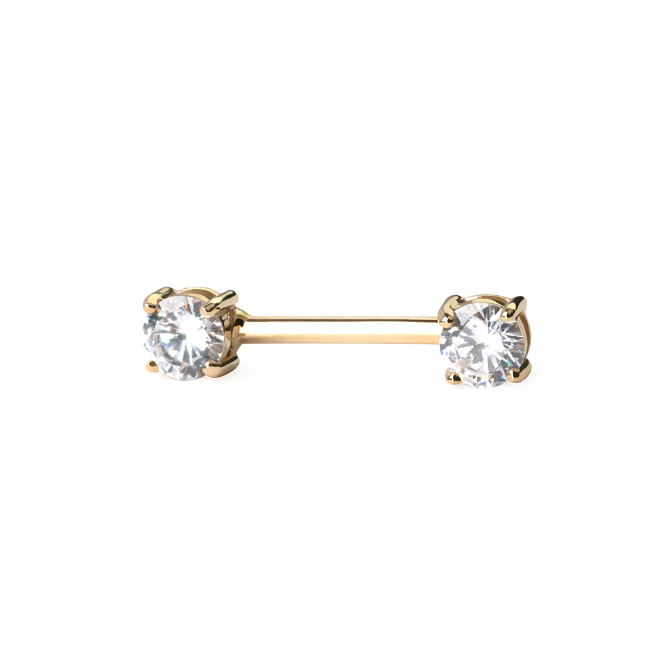 Ez a csodaszép mellbimbópiercing két különböző színben kapható. A klasszikus sárga arany modell színe kontrasztot alkot a kő fehérségével, a fehérarany darab pedig stílusos megjelenést biztosít.