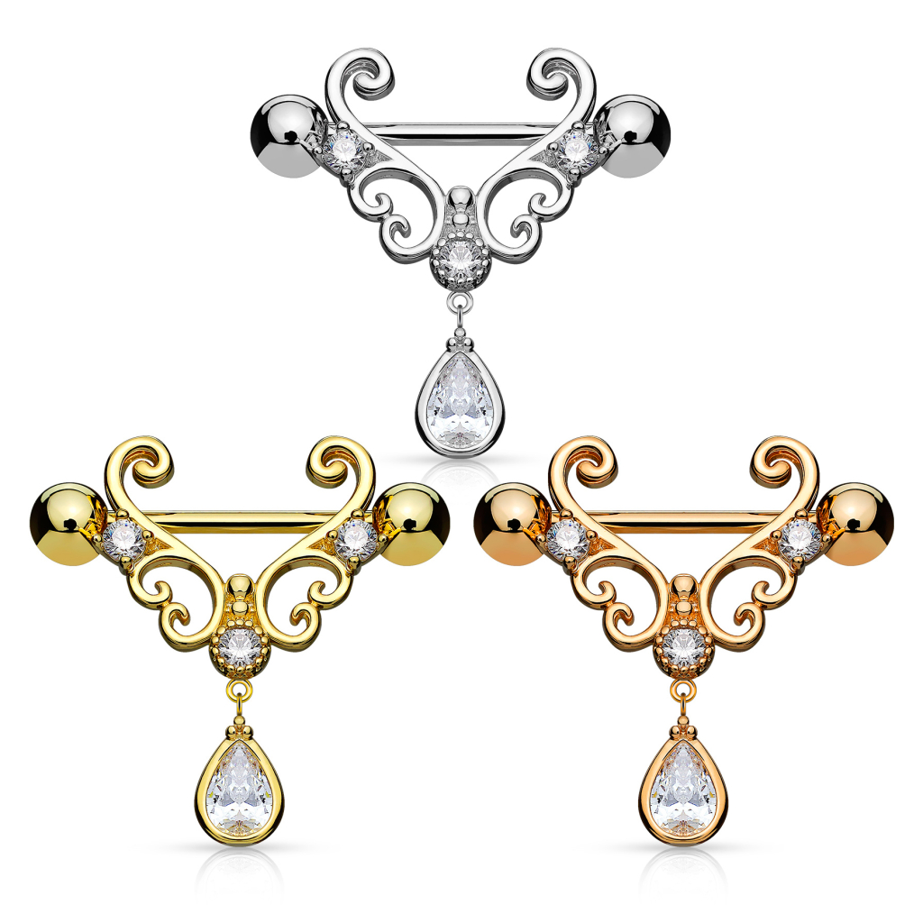 Ha már képen is gyönyörűnek találod a mellbimbó pajzsot, képzeld el, hogy magadon milyen elképesztően mutatna! Az ékszer mesés alakja lenyűgözően fest a mellbimbó körül. Összesen 4 kő díszíti a pajzsot: kettő a két oldalán, egy középen, egy pedig az utóbbiról lóg, csepp alakban. Emellett végig hullámzó és szív alakú motívumok figyelhetőek meg a pajzson, amik igazán különlegessé teszik az ékszert.