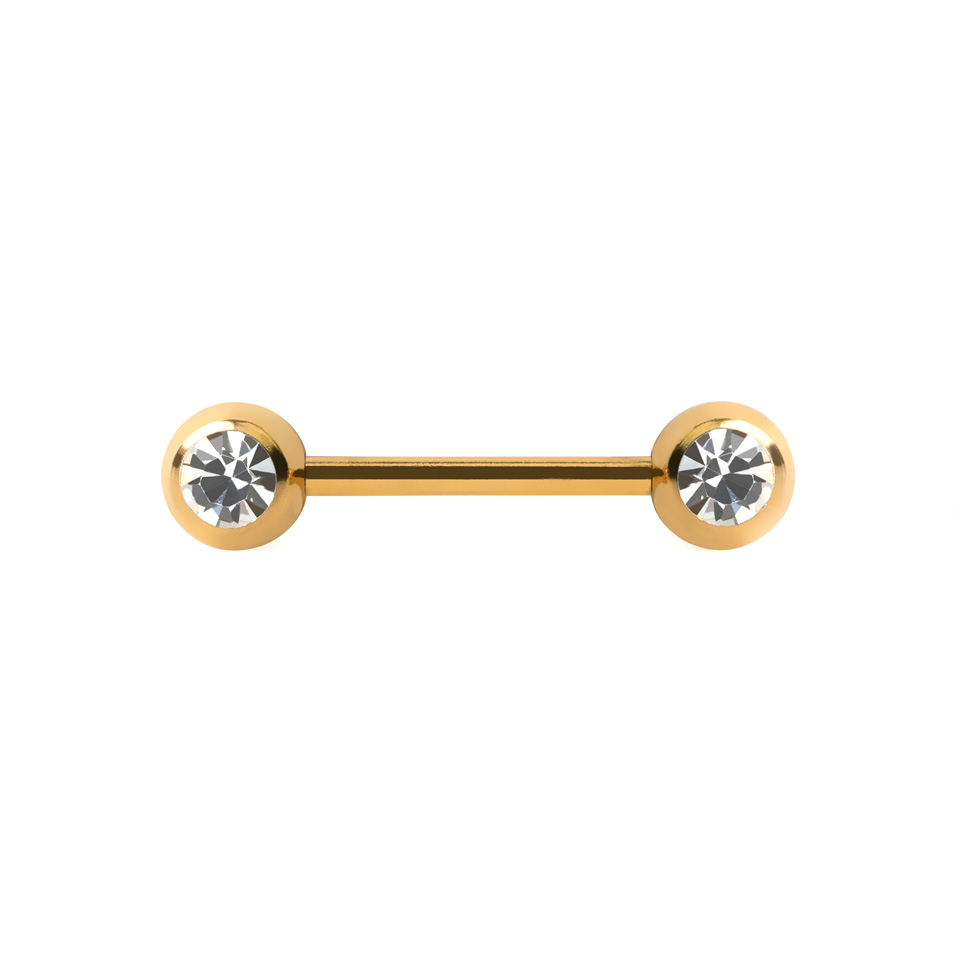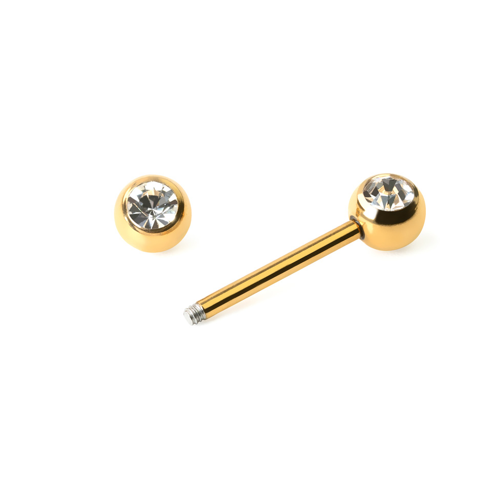 A barbell mindkét végén 6 mm-es golyó található. Nem egy diszkrét ékszer, mivel a golyók igencsak szembe tűnőek. A golyókban emellett egy gyémánt alakúra csiszolt ékkő is található. Amikor rájuk süt a fény, csak úgy ragyognak.