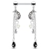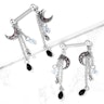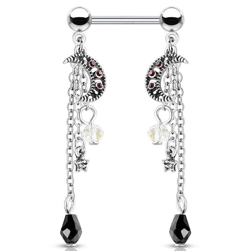 A képen látható mell piercinget gyakorlatilag a fél galaxis díszíti, ennél nehezebben találsz majd különlegesebb modellt. A szár 14 mm hosszú és orvosi acélból készült, végeit két klasszikus golyó zárja le, ezekről lógnak le a tematikus kis díszek.