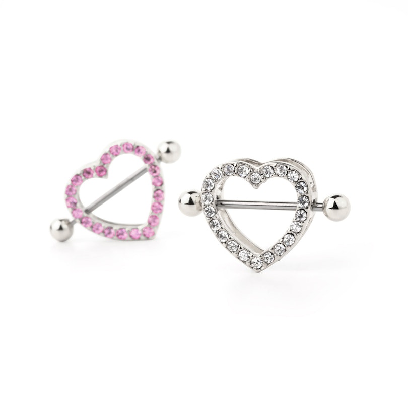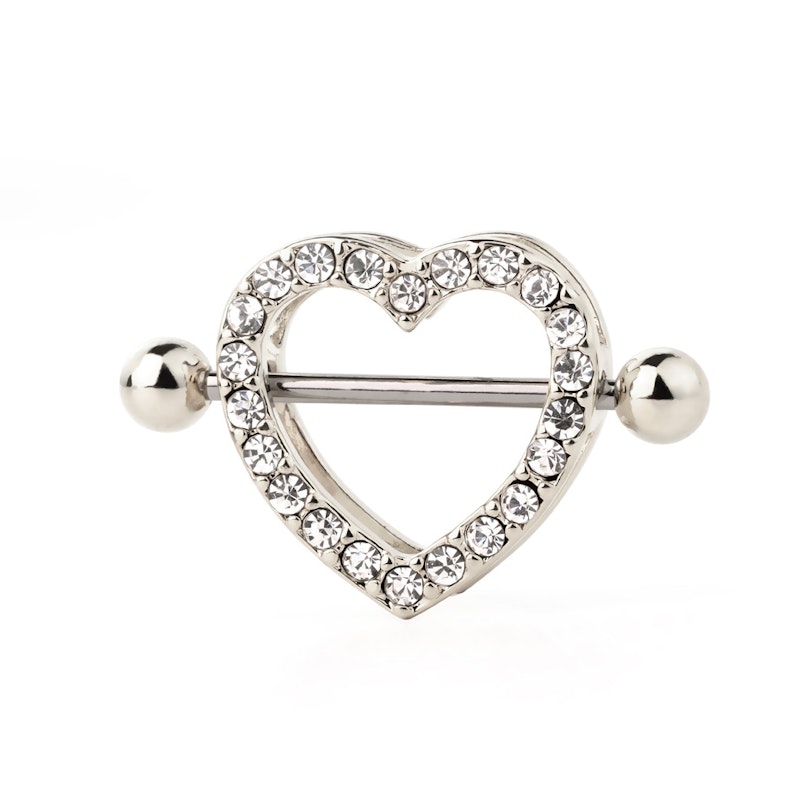Mell piercing szív formájú, csillogó kövekkel díszített mellbimbó pajzzsal