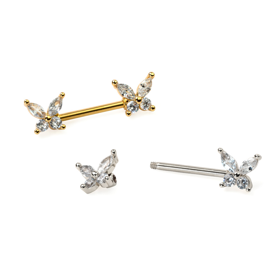 Két különböző szín közül választhatsz - nem számít, hogy melyik mellett döntesz, az ékszer ugyanaz. A barbell orvosi acélból készült, ami a piercingékszerek leggyakrabban használt anyaga. A pillangókat sárgarézből formázták, és ródiummal, illetve PVD-vel vannak bevonva.