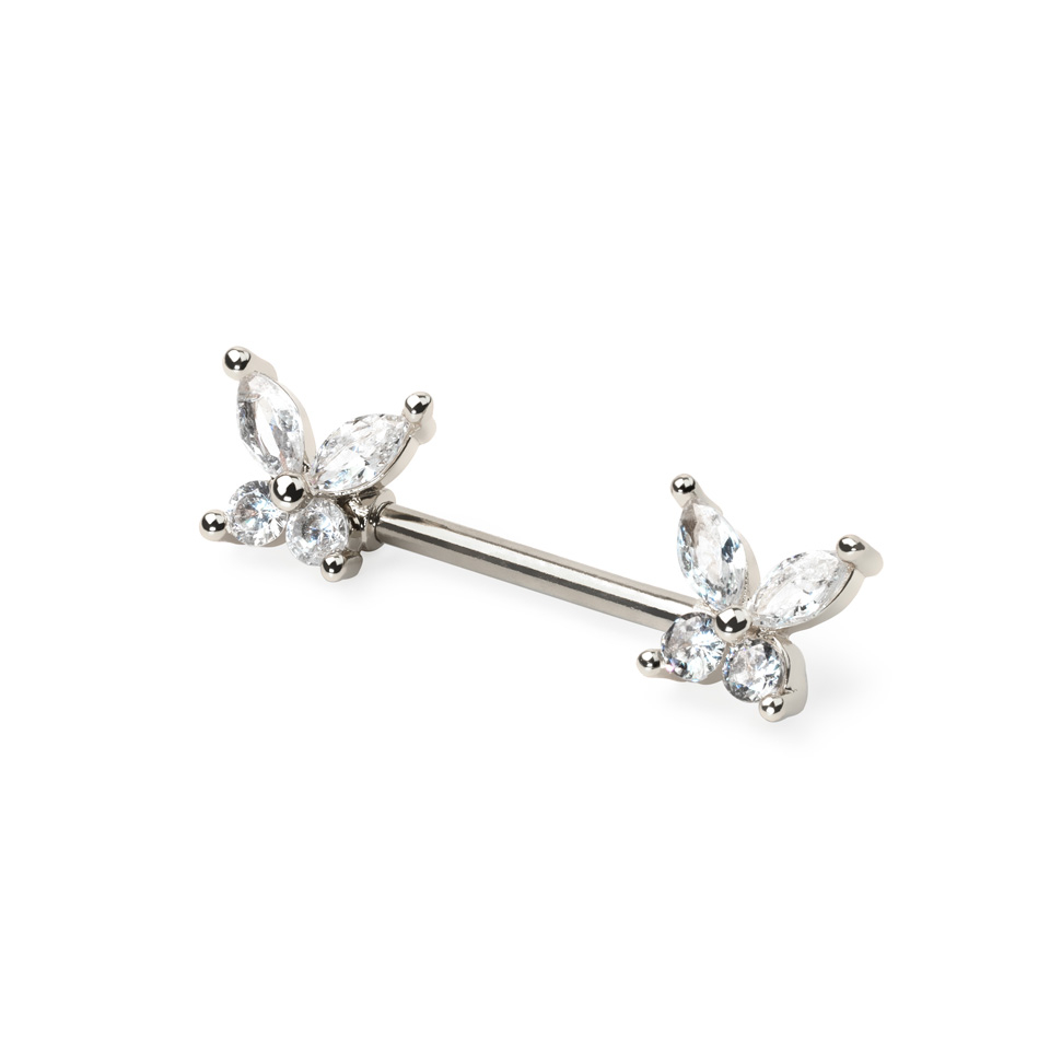 Ez a hangsúlyos ékszer a minőség és a divat megtestesülése, és kötelező darab kellene, hogy legyen a gyűjteményedben. A pillangók szárnyai mindkét végen cirkónia kövekkel vannak kirakva, amelyek kifinomultsággal egészítenek ki egy nagyon aranyos mellbimbó-piercinget.