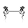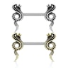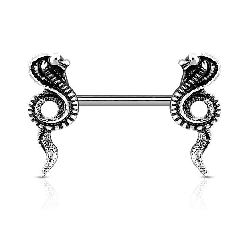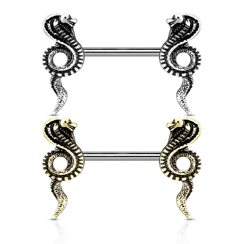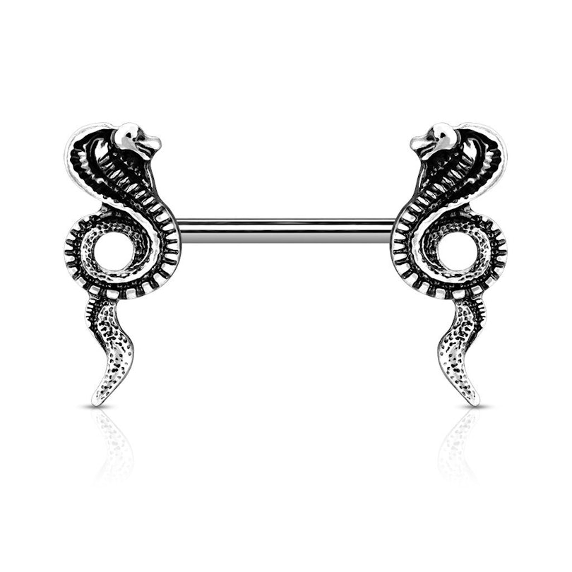 Ez az ékszer a dizájnja miatt egyáltalán nem nevezhető megszokottnak. A hagyományos mellbimbó piercingek egy szárból és két golyóból állnak, itt azonban a tervezők képzelete szárnyalt. A szár anyaga orvosi acél, a két végét egy-egy kobra díszíti. A kígyók sárgarézből készültek, majd ezüst vagy arany bevonatot kaptak. Mindkét szín remekül mutat. Mivel az ékszer kifejezetten mellbimbó piercingnek készült, a viselését más testrészben, például nyelvben nem ajánljuk.