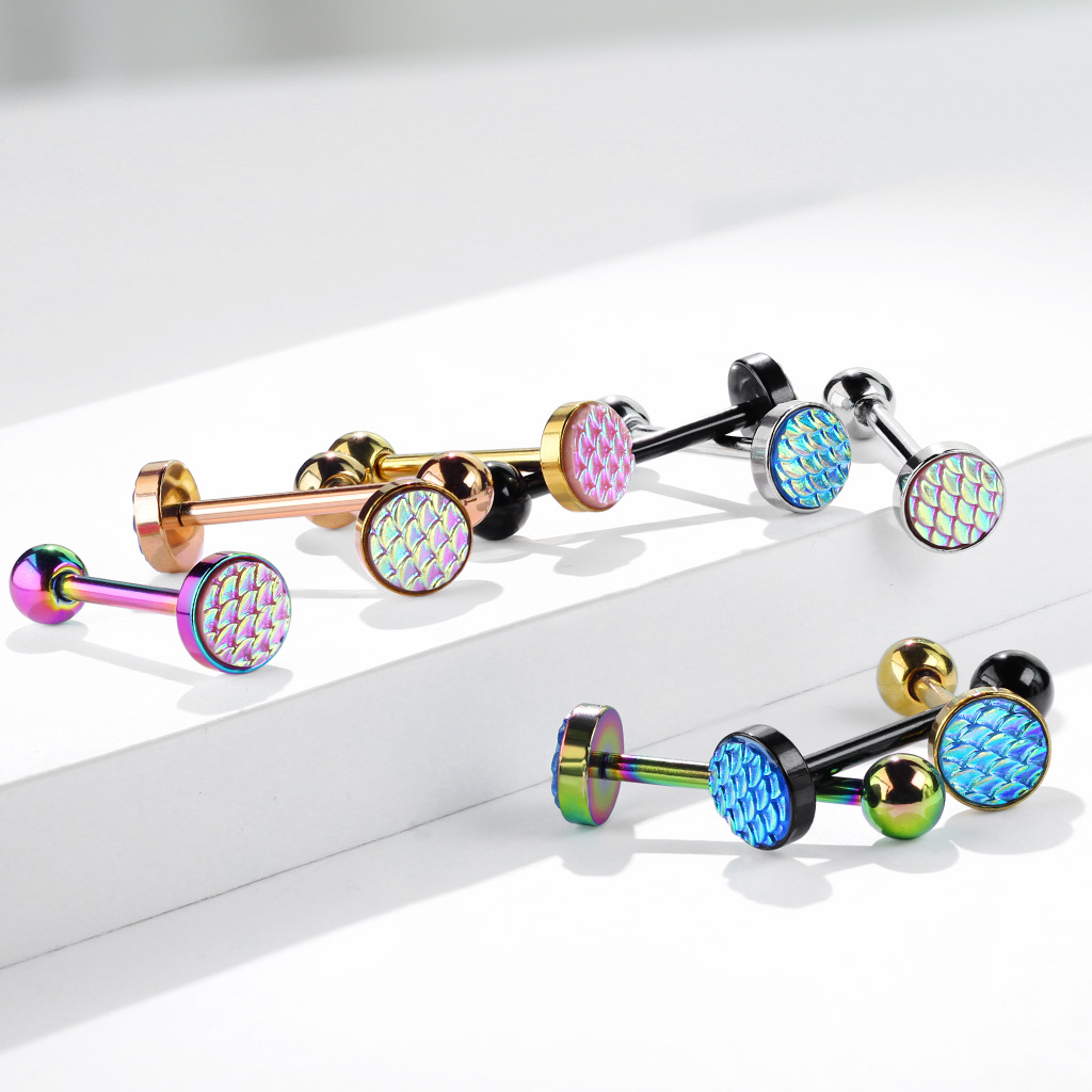 A képen látható nyelvpiercing egy rendkívül eredeti darab. A felső golyó felülete színváltós, a mintája a halpikkelyre emlékeztet. A minta anyaga gyanta, amely az aktuális fényviszonyoknak megfelelően mindig más árnyalatban pompázik. Ha a rózsaszín pikkelyekkel díszített modellt választod, a rózsaszín különböző árnyalataiban gyönyörködhetsz. A szár színét is te választhatod ki, mindegyik különleges és élettel teli hatást kelt.
