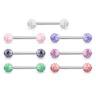 Orvosi acélból készült nyelvpiercing különböző színű akril golyókkal.