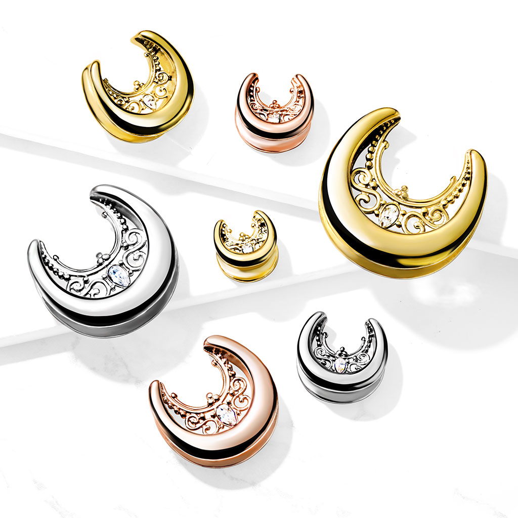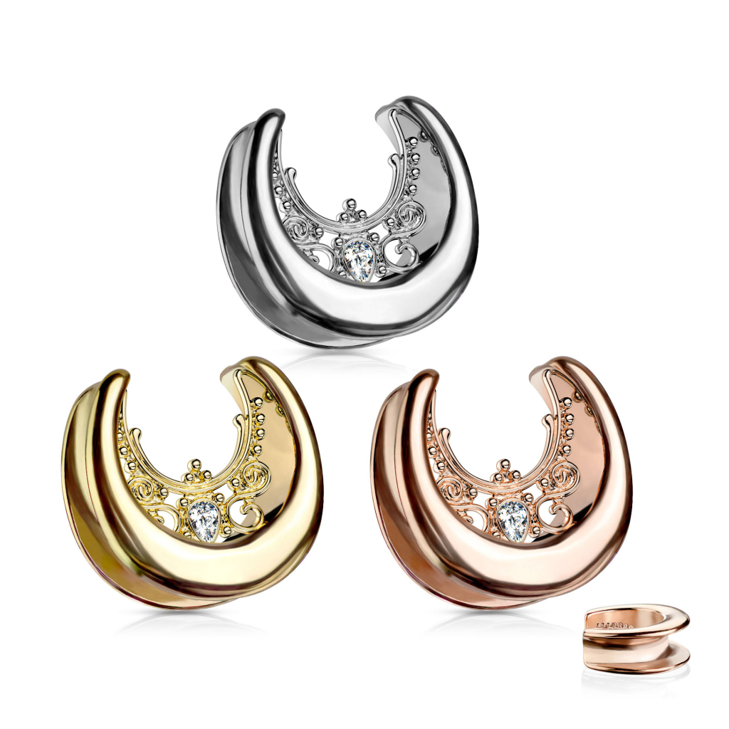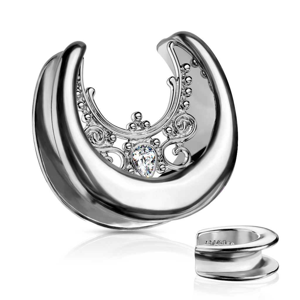 Ez a nyerges fültágító hasonlít a klasszikus nyerges fültágítónkhoz, a kis csavart kivéve, amely a belsejében foglal helyet. Ennek neve filigrán, és apró csavart részekkel kombinált csepp alakú díszek alakítják. A dizájn olyan, akárcsak egy gyönyörű hímzett minta, közepén egy csepp alakú átlátszó kő kap helyet, ezzel megkoronázva a kompozíciót.