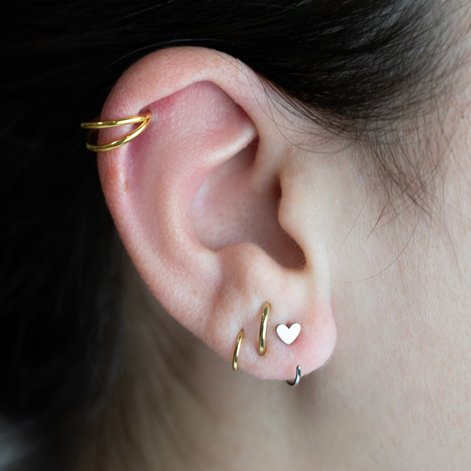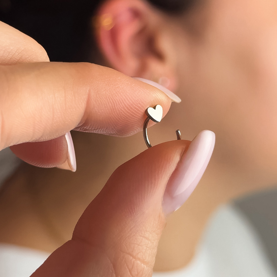 A szíves, titán nyitott karika pont az a laza kis kiegészítő, amire a fülcimpádnak szüksége van. Nyitott íve könnyedén rácsúszik a fülcimpára. Csak csúsztasd be a nyitott végét a piercingedbe, fordítsd előre, és hagyd, hogy megtalálja a helyét. Kényelmesen ül akár az alsó fülcimpán, a felső fülcimpán, vagy más karikákkal kombinálva. A szív dísz mindig előre néz, tiszta, tudatos megjelenést adva.