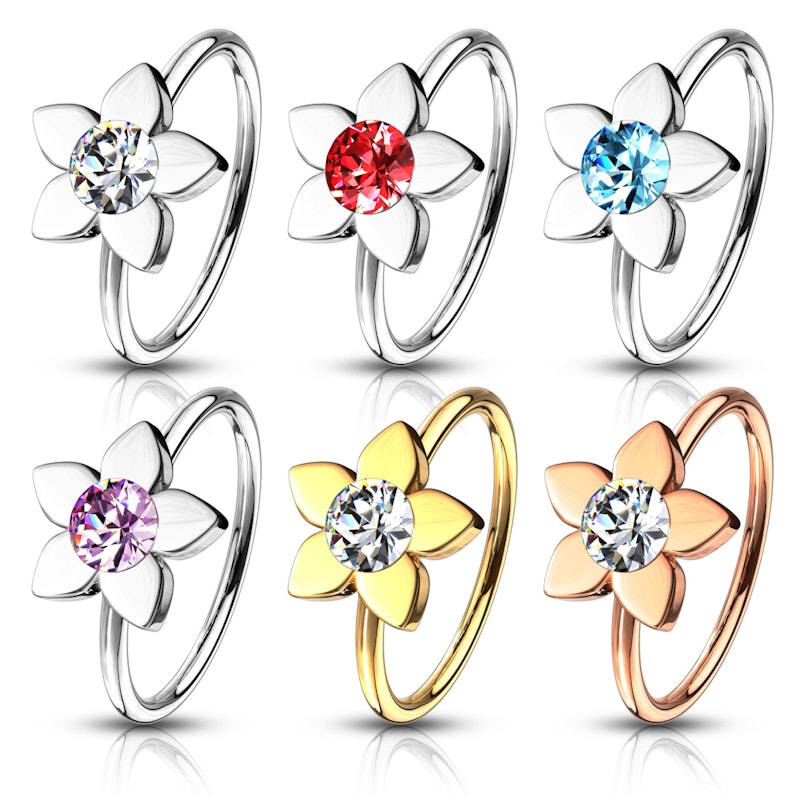 A piercing dísze egy öt szirmú virág forma, közepén egy nagyobb méretű csillogó kővel, melynek te választhatod ki a színét (lehet például piros vagy rózsaszín is, de nézd meg mindet mielőtt választassz).