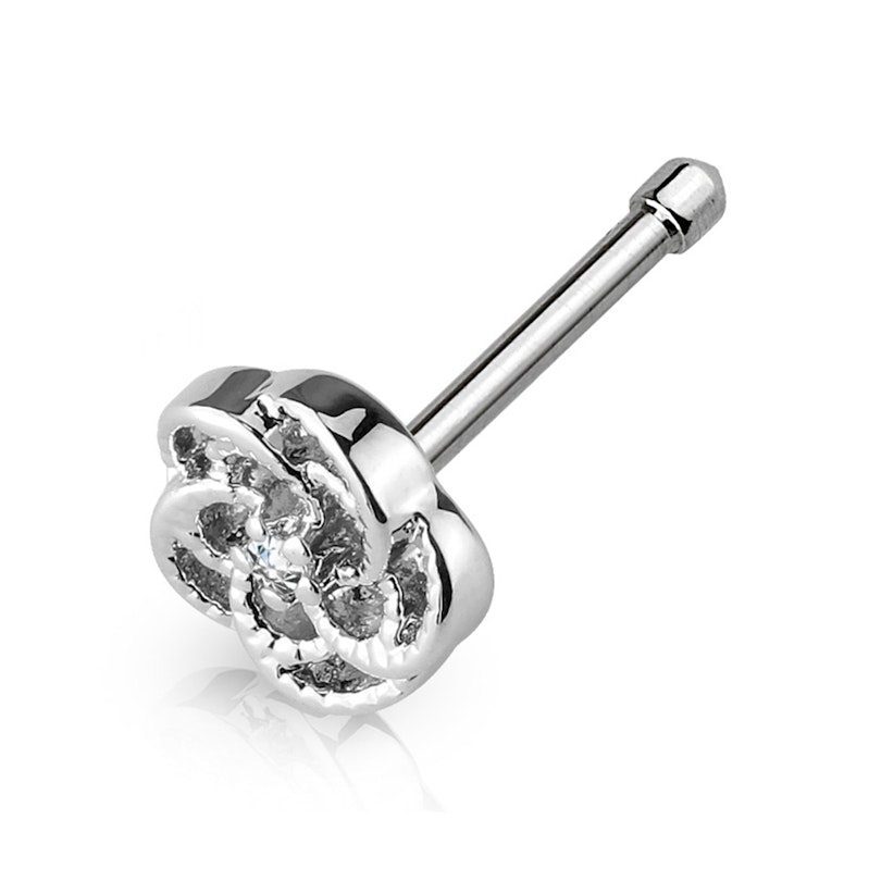 Ezt az édes kis orrpiercinget egy finom rózsa disziti. A rózsa felülete lyukacsos, igy imitálja a szirmokat, mint egy kis faragott szobor.