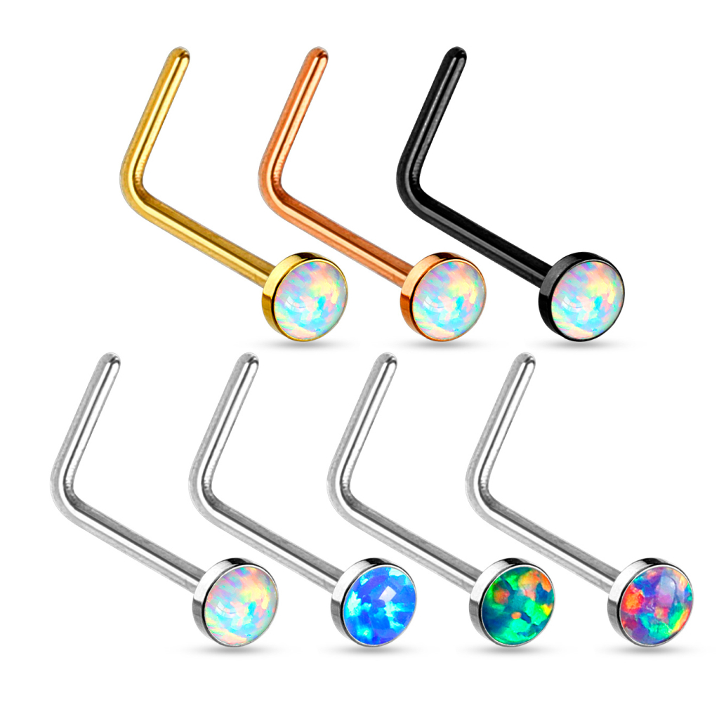 Mikor ez az ékszer az orr piercingedben van, a szár rész színét nem fogod látni, csak azt a részét, amely körülöleli az opál követ. A szár L-alakú, 90°-os szögben hajlított végű, és könnyed behelyezést illetve kivételt biztosít.