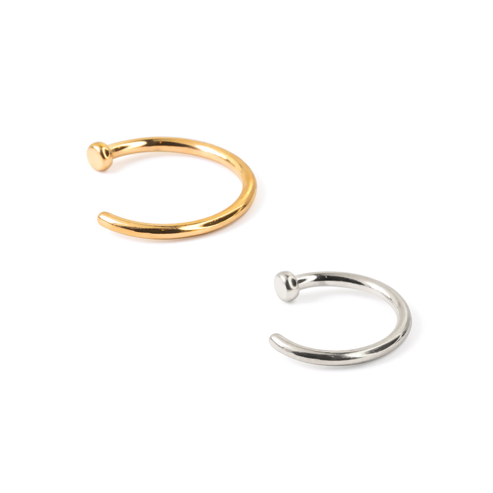 A karika egyik vége vastagabb, ez a rész megakadályozza, hogy kicsússzon az orrodból. A másik végét lekerekítették és lecsiszolták, így behelyezéskor nem sérti fel a bőrödet. Az ékszer több méretben kapható, és még a szinét is megválaszthatod..
