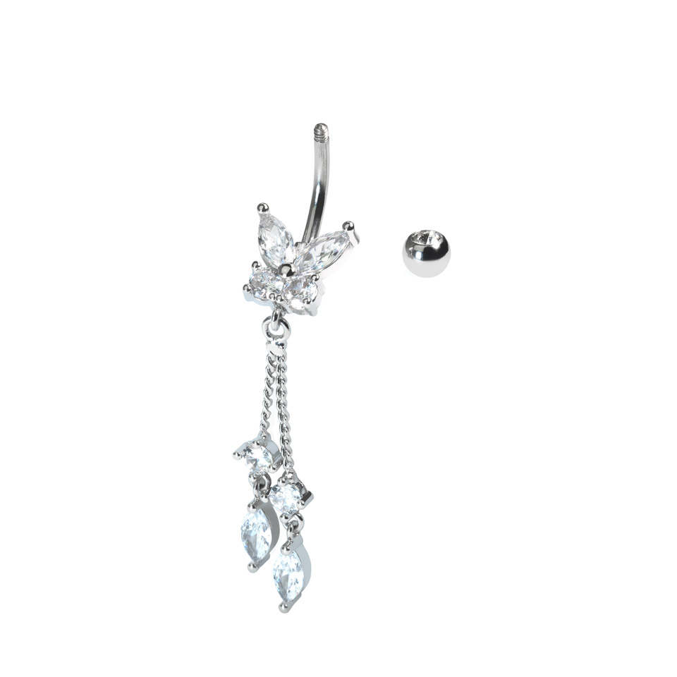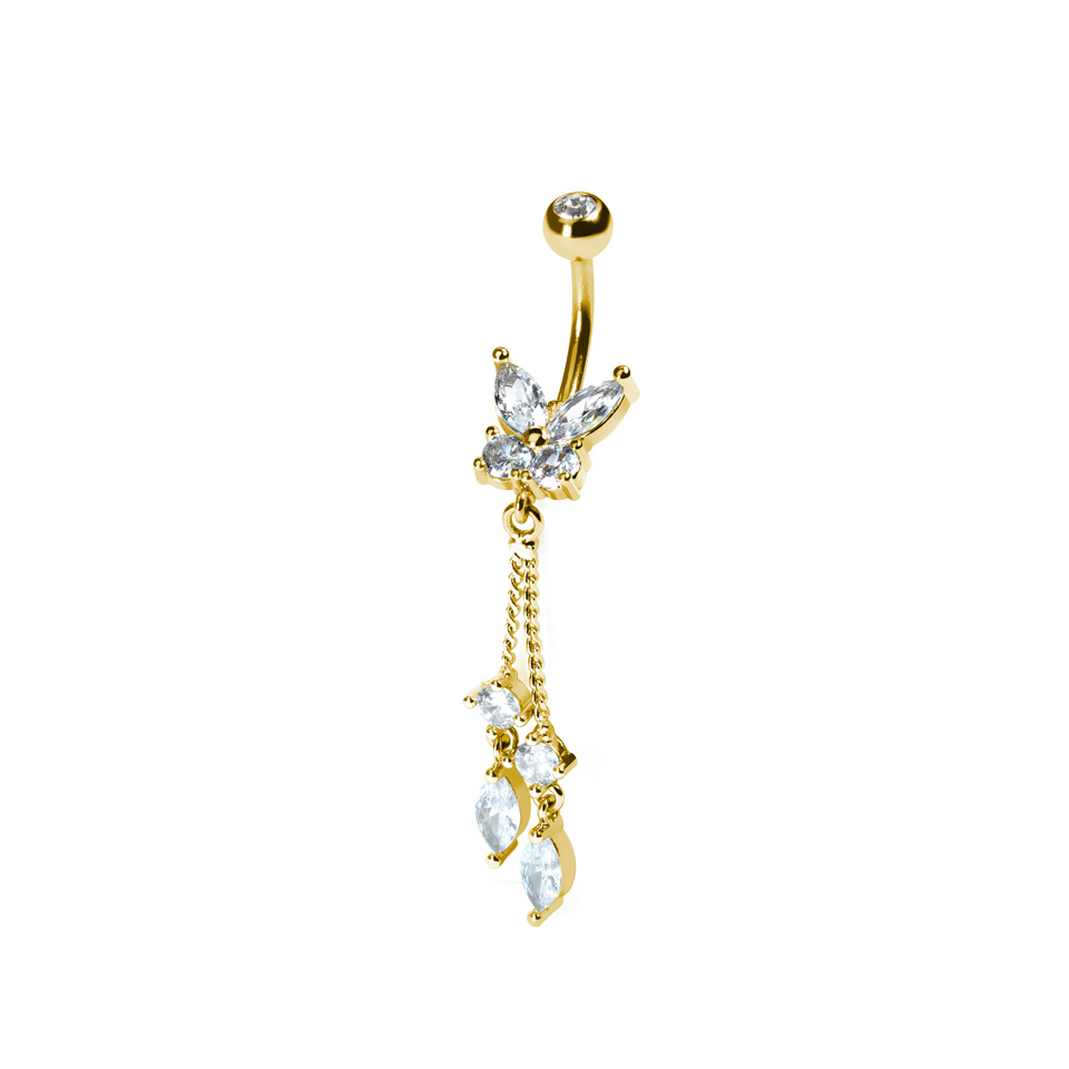 Ennek a csillogó köldökpiercingnek az alsó golyóján gyönyörű pillangó található. A pillangóról vékony láncokon medálok lógnak, amelyeket még több tündöklő kő díszít.