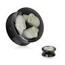 Ha már borzasztóan unod, hogy nem találni egy vadabb plugot, akkor végre fellélegezhetsz. Fent a képen ugyanis egy akril plugot látsz, amiben három fehér kis koponya van elrejtve, arccal felfelé.