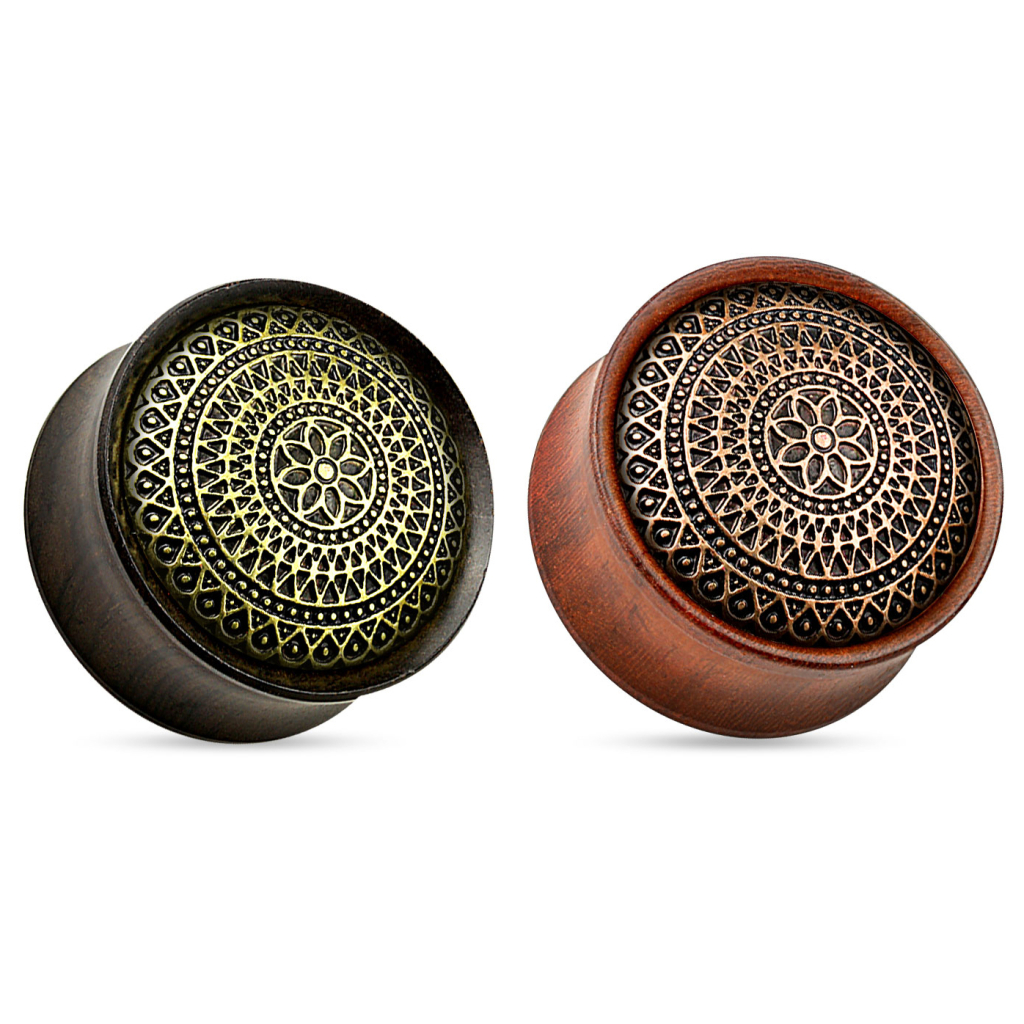 Díszítsd füledet ezzel a gyönyörű fából készült pluggal, amelyet arany színű dekoratív motívum ékesít. A plug közepén gyönyörű virág látható, szimmetrikus hálószerű mintázattal körülvéve.
