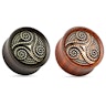 A három spirálból álló szépséges motívum szimmetrikusan helyezkedik el a pöttyök körül. Ez a rész rézlemezből készült, amely tökéletesen harmonizál a fa színvilágával. A rózsafából készült modellnél a mintázat aranyló színe vegyül a fa meleg tónusaival. Azonban, ha még inkább szeretnél kitűnni a tömegből, az ébenfából készült változat is remek választás. A fa sötét színe még nagyobb kontrasztot ad az aranyló tribal mintának.