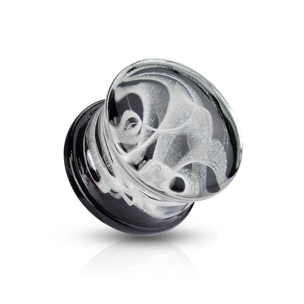 A tágító anyaga áttetsző üveg, a fekete háttér előtt remekül mutat a statikus, füstre emlékeztető minta. Ez a minta minden darabon más és más, a nagyobb méretű tágítókon természetesen nagyobb.