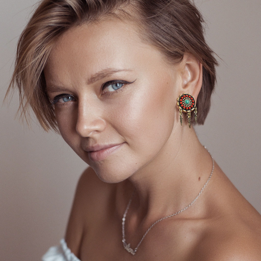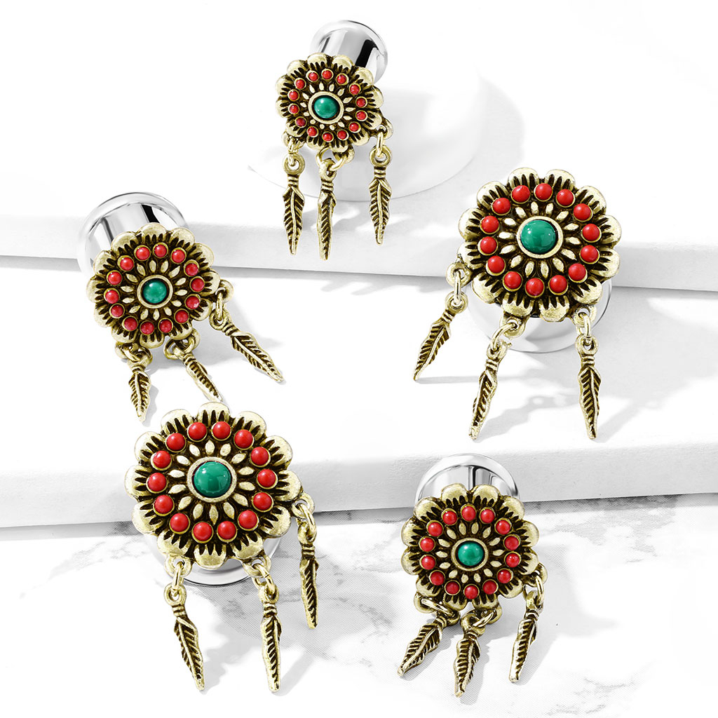 Ez a plug egy olyan dekorelemmel lett díszítve, amely egy virághoz hasonlít. A virág közepén egy türkiz akril gyöngy található, amely gyönyörűen illeszkedik a körülötte lévő vörös gyöngyökhöz. A plug széle körül egy kis levelekből álló keret emeli ki a virágot. Ez nem csak egy egyszerű virág rengeteg részlettel, hiszen az ékszeren három toll is található, amelyek szabadon lógnak és követik a tested mozgását.