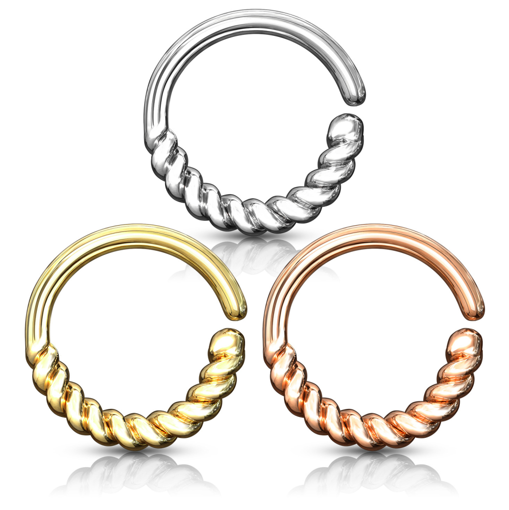 Ez a darab egy nem túl kirívó, mégis nagyon szép, letisztult formájú piercing, aminek alsó fele (ami látszik) fonat szerűen mintázott. Mivel nincs záró mechanizmusa, a nyílás mentén tudod majd ki/be tenni az ékszert (óvatosan szét kell húznod, majd összenyomnod).