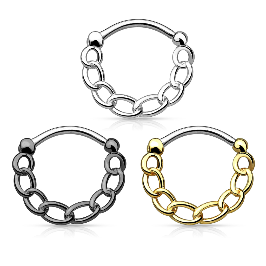 A septum karika alsó ívét lánc díszíti, ami vadságot sugároz, nem a megszokott hercegnős, csillogó köves kialakítás. A lánc merev, így nem mozog veled együtt, mindig megőrzi kerek formáját.