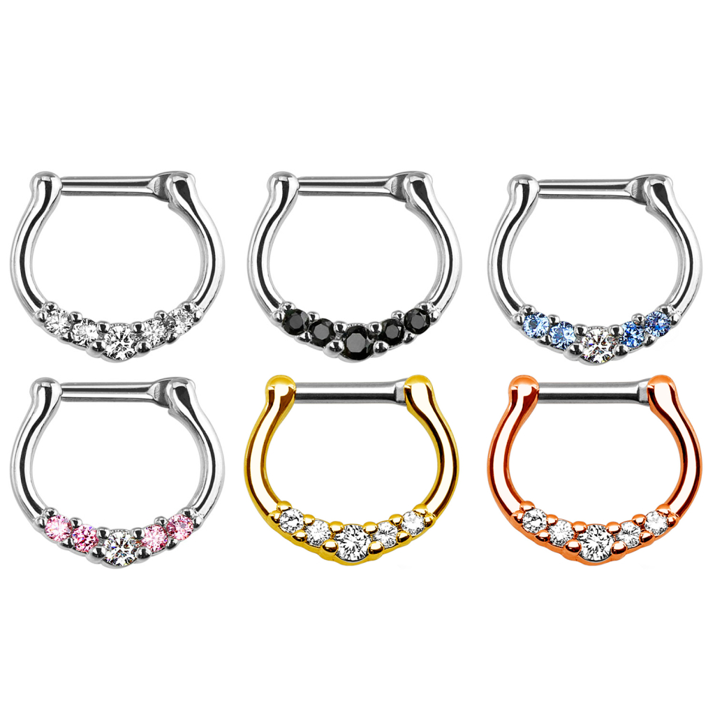 Gyönyörű és nőies kapcsos septum piercing orvosi acélból, öt csodaszép kővel díszítve. A kerek ékkövek az ékszer alsó ívét díszítik, sugározva magukból a nőiességet. A középső kő nagyobb, míg a piercing széle felé haladva a többi mérete arányosan csökken.