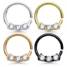 A legtöbb septum piercing nagy és mutatós; kevés olyan modell van, amely csak egy sima karikából áll. Valamint abban az esetben, ha köves berakással is rendelkezik az ékszer, akkor még nagyobb és szembetűnőbb lehet. Ha szeretnél egy diszkrét és elegáns megjelenést, arra kérünk vess egy pillantást erre a gyönyörű septum ékszerre, melyet három apró kő is díszít.