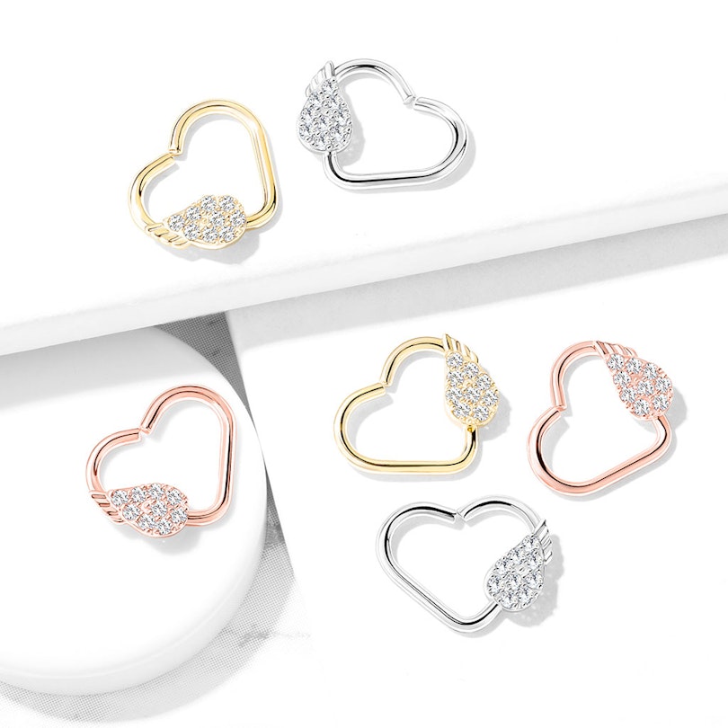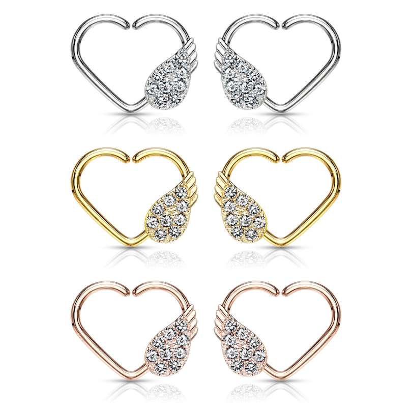 A szív szárának egyik oldalát egy apró kövekkel kirakott kis angyalszárny díszíti. Ha az ékszert a jobb füledben hordod, a szárny a jobb oldalon lesz, ha a bal füledbe rakod, akkor pedig a bal oldalon. Ez azt jelenti, hogy ugyanaz a modell nem alkalmas mindkét füledhez, különben az angyalszárny hátrafelé néz. A szív belsejének szélessége 11 mm, magassága 8 mm. Az ezüst színű modellen a szív és a szárny platina, a két arany színű modell pedig 14 karátos arany bevonatot kapott.
