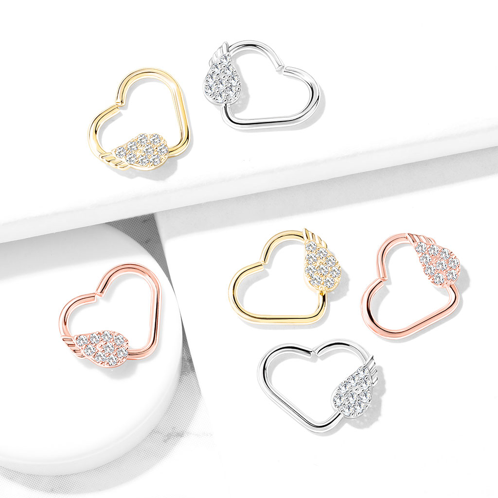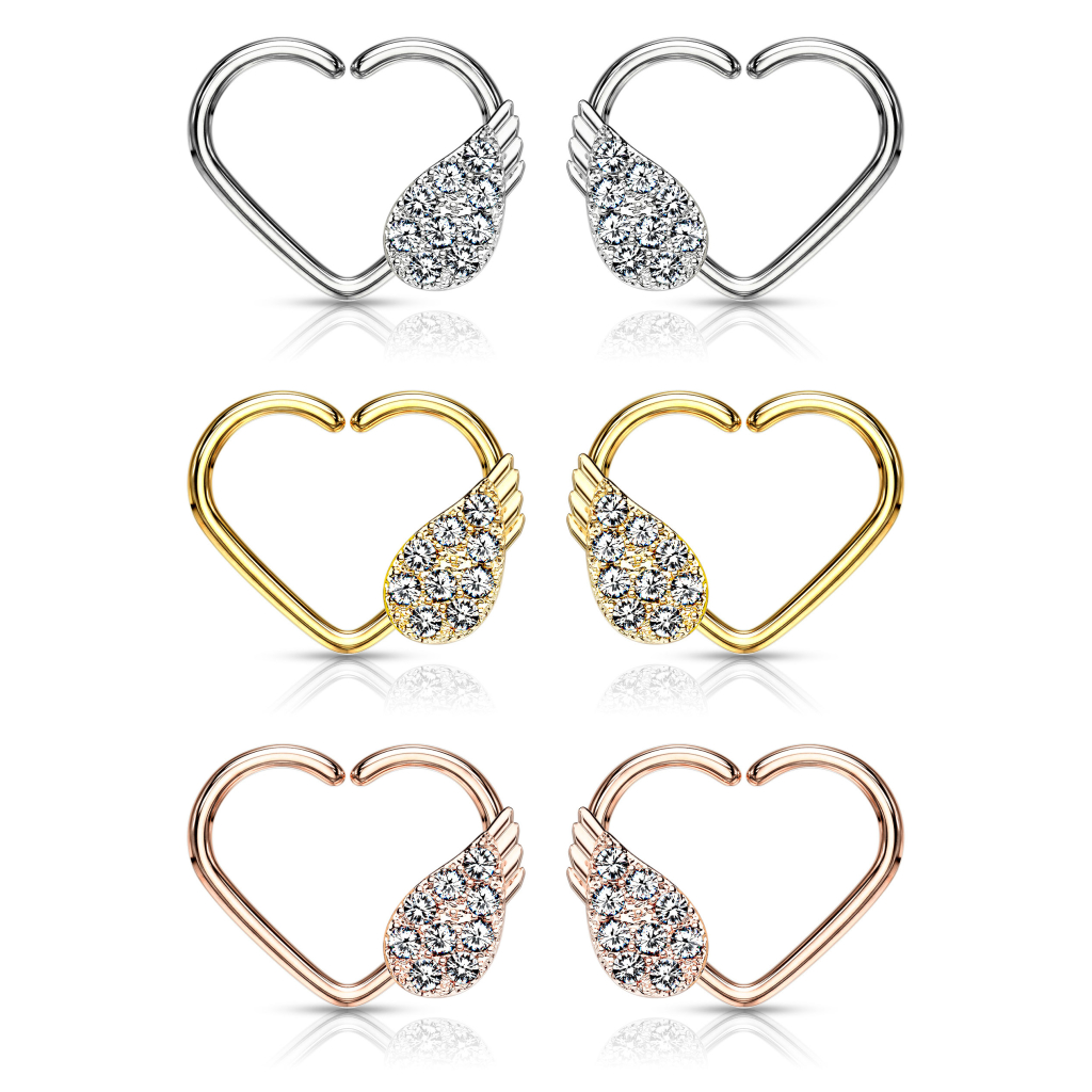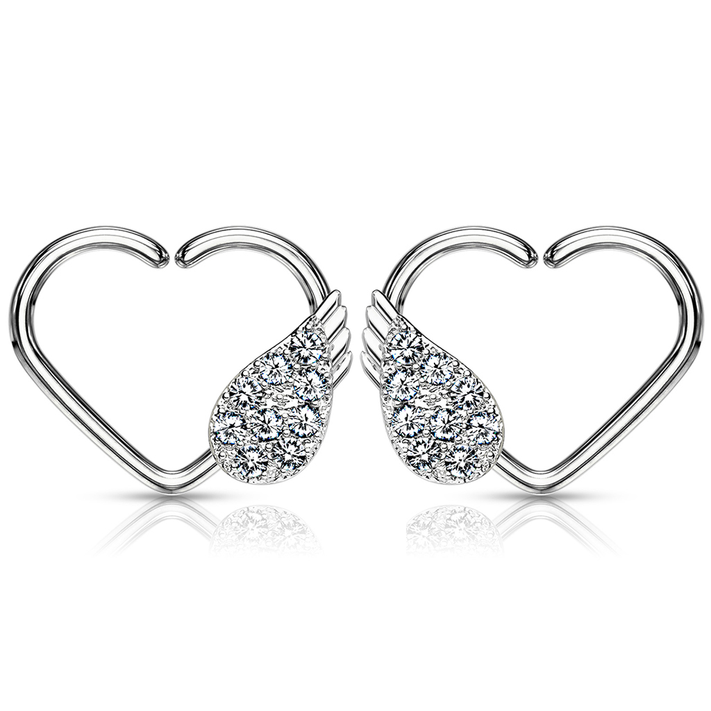 A szív szárának egyik oldalát egy apró kövekkel kirakott kis angyalszárny díszíti. Ha az ékszert a jobb füledben hordod, a szárny a jobb oldalon lesz, ha a bal füledbe rakod, akkor pedig a bal oldalon. Ez azt jelenti, hogy ugyanaz a modell nem alkalmas mindkét füledhez, különben az angyalszárny hátrafelé néz. A szív belsejének szélessége 11 mm, magassága 8 mm. Az ezüst színű modellen a szív és a szárny platina, a két arany színű modell pedig 14 karátos arany bevonatot kapott.