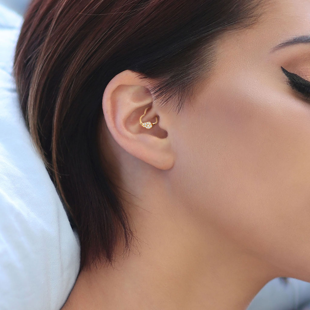 Ez a piercing egy hosszú, sárgarézből készült szárból áll. Az ékszer szív alakú, a tetején egy kis lyukkal. A nyitáshoz a két végét csavard ellentétes irányba, előre és hátra, anélkül, hogy a szárat oldalra húznád.