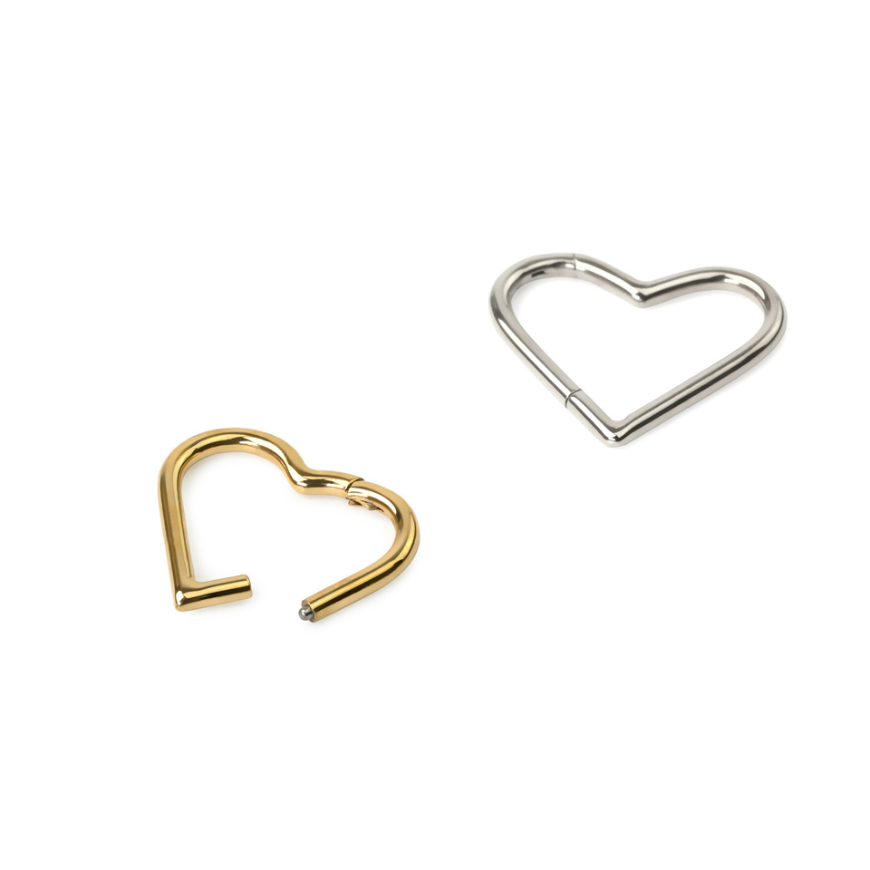 Ez a kapcsos karika egyik kedvenc formánkat kapta: a szív formát. Ha egy olyan piercing karikát keresel ami egyszerre elegáns és aranyos üzenetet közvetít, ne keress tovább. A karika kapcsos zárral nyílik, ami megkönnyíti a dolgod. Csak nyisd ki a zárat, helyezd be piercingedbe, majd zárd vissza. Különböző fül, vagy orrpiercingben is hordhatod ezt a csinos szívet.