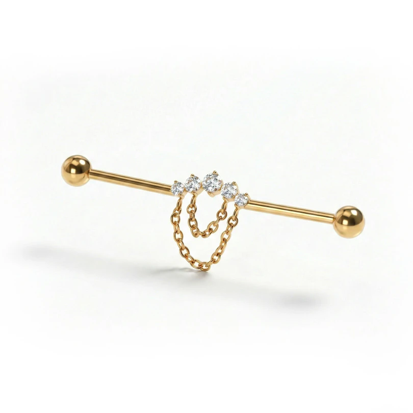 A kövekkel és láncokkal díszített titán industrial barbell extra részleteket ad a klasszikus industrial formához. Apró kövek futnak végig a száron, amelyeket finom láncok kötnek össze, így rétegzett, mégis harmonikus és jól viselhető megjelenést kap. Feltűnő anélkül, hogy túl harsány lenne, és ideális választás, ha szereted a visszafogott, mégis egyedi variációkat a szettedben. Arany- és ezüstszínben kapható.